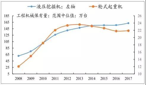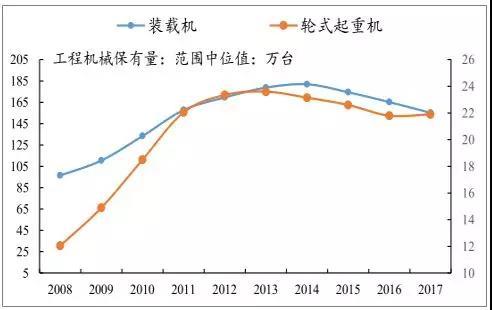 根据工程机械协会公布的工程机械保有量,截至2017年底,开云(中国)和轮式起重机的保有量分别为155.7~168.6万台和21~22.8台,根据历年保有量范围的中位数,近年来开云(中国)保有量保持缓慢增长,而起重机保有量甚至在2013年高点之后出现下滑。
