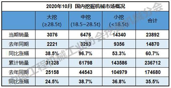 2020年1-10月,共销售挖掘机263839台,同比增长34.5%;其中国内236712台,同比增长35.5%;出口27127台,同比增长25.9%