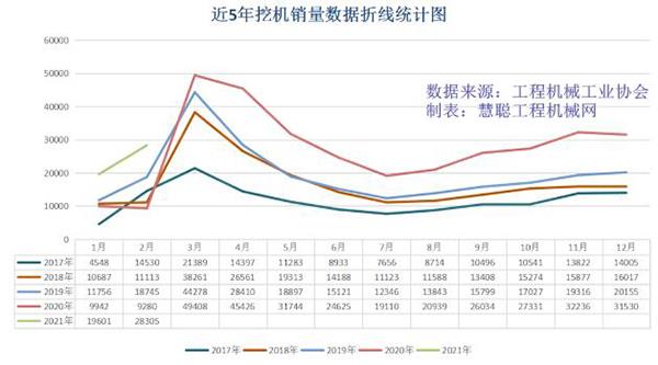 2021年2月挖掘机销量数据创2月历史新高,之前最高年份为2011年2月的20570台,2021年2月的28305台,超出2011年2月约38%。2021年1-2月累计4.79万台,比2011年1-2月累计3.17万台,超过约51%。