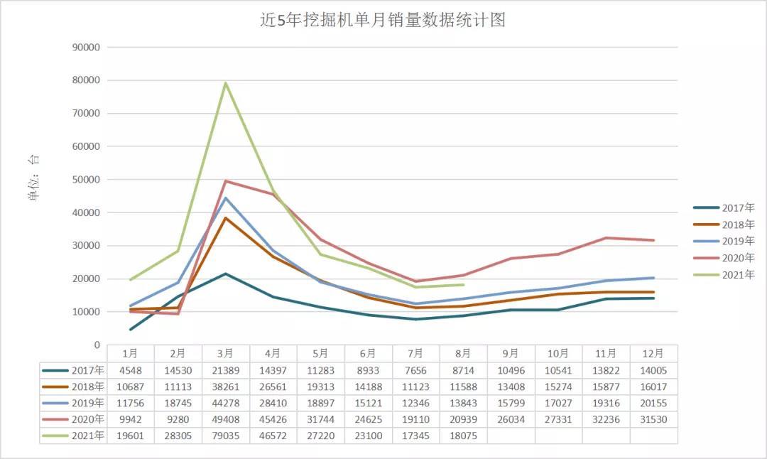 今年1-8月,共销售挖掘机259253台,如果以2020年总销量327605台为目标,剩下四个月要达到68352台月均17088台的销量还是较为容易的(2020年8-12月月均销量29283台,2019年8-12月月均销量18074台)。因此,预计2021年开云(中国)销量仍将超过2020年,出现新的销量记录。