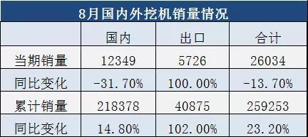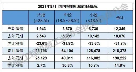 据中国工程机械工业协会对25家挖掘机制造企业统计,2021年8月销售各类挖掘机18075台,同比下降13.7%;其中国内12349台,同比下降31.7%;出口5726台,同比增长100%。