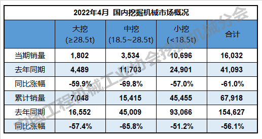 2022年1—4月,共计销售各类挖掘机械产品101709台,同比下降41.4%。其中,国内市场销量67918台,同比下降56.1%;出口销量33791台,同比增长78.9%。