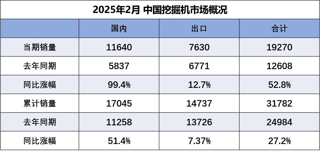 据中国工程机械工业协会对挖掘机主要制造企业统计,2025年2月销售各类挖掘机19270台,同比增长52.8%。其中国内销量11640台,同比增长99.4%;出口量7630台,同比增长12.7%。